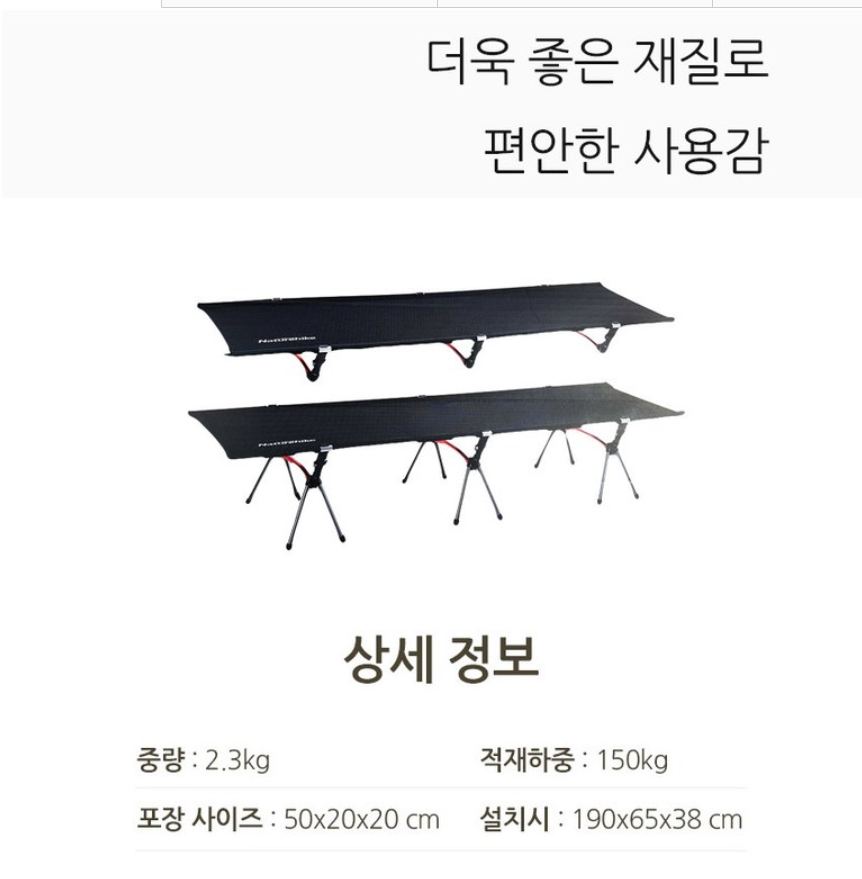 앞서 본 네이처하이크와 비교해보면 뭔가 다리가 더많고 그래서 그런지 안정적인 느낌이 강하네요. 과연 실제로도 더 안전할까요 아직 안써봐서모르겠네요. 마운트리버는 뭔가 감성캠핑하기에 적합한거같아요. 이 마운트리버 야전침대는 위의 네이처하이크 야전침대보다 가격이 8만원정도 더 높게 형성이 되어있네요 역시 NH야전침대는 가격 성능 깡패 덜덜..